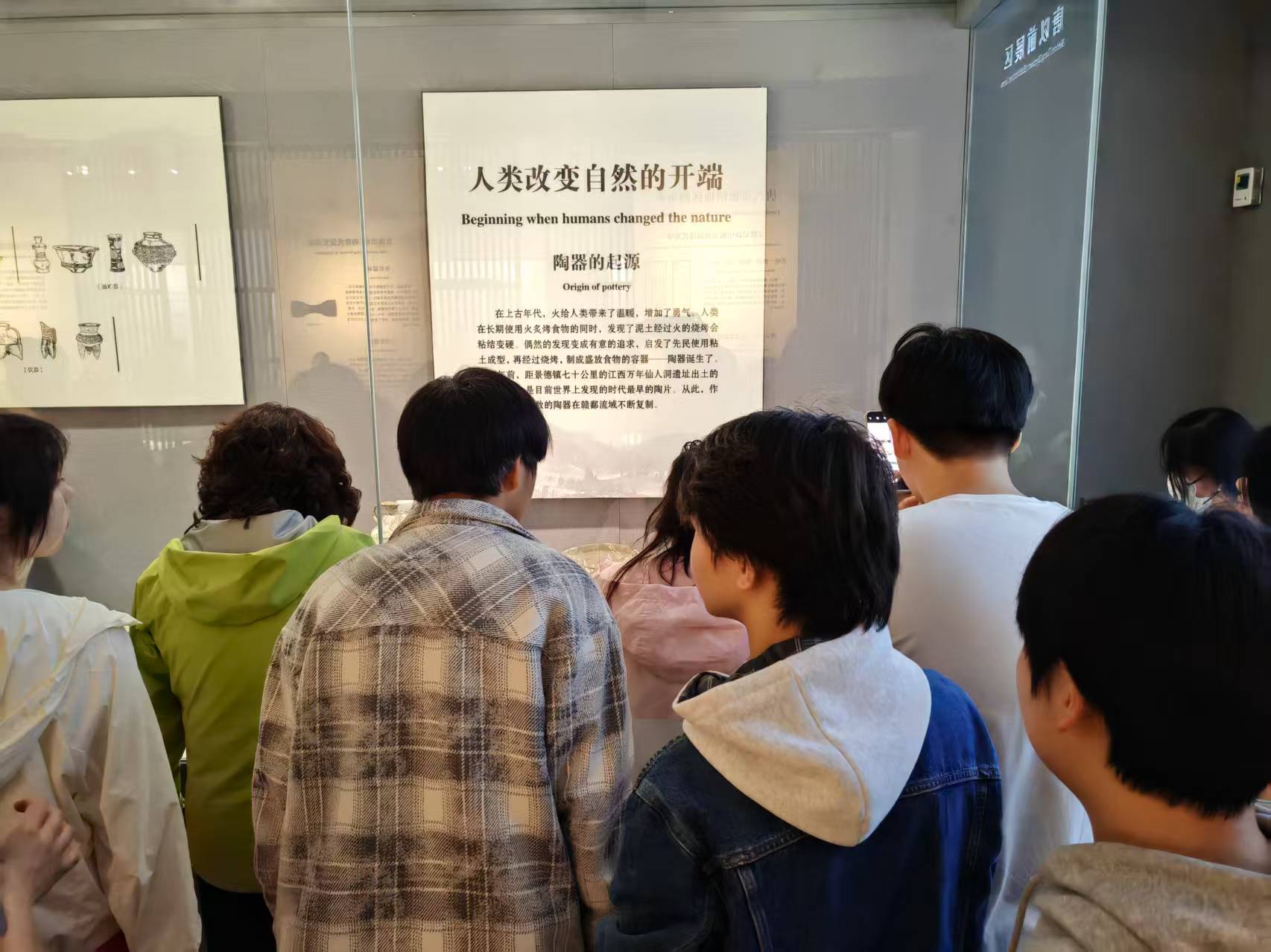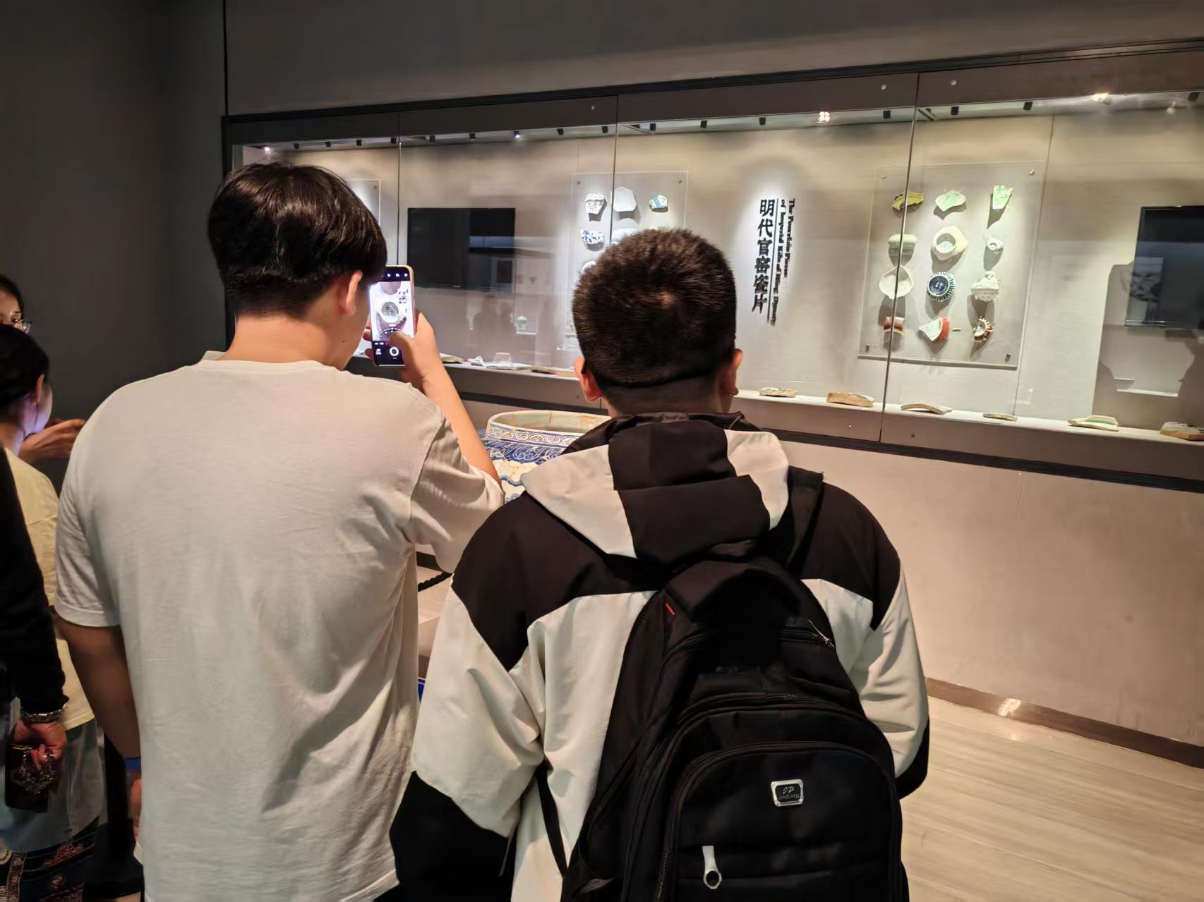 学生们围绕在展柜前,认真记录、踊跃提问,通过观察陶瓷断面胎釉结合、釉面开片、气泡疏密等细节,直观理解了“窑变”“缩釉”“芒口”等抽象概念。不少学生感叹:“课本上的图片远不如亲眼所见来得震撼,跟着发展史脉络看文物,每个朝代的特点一下子清晰了。”